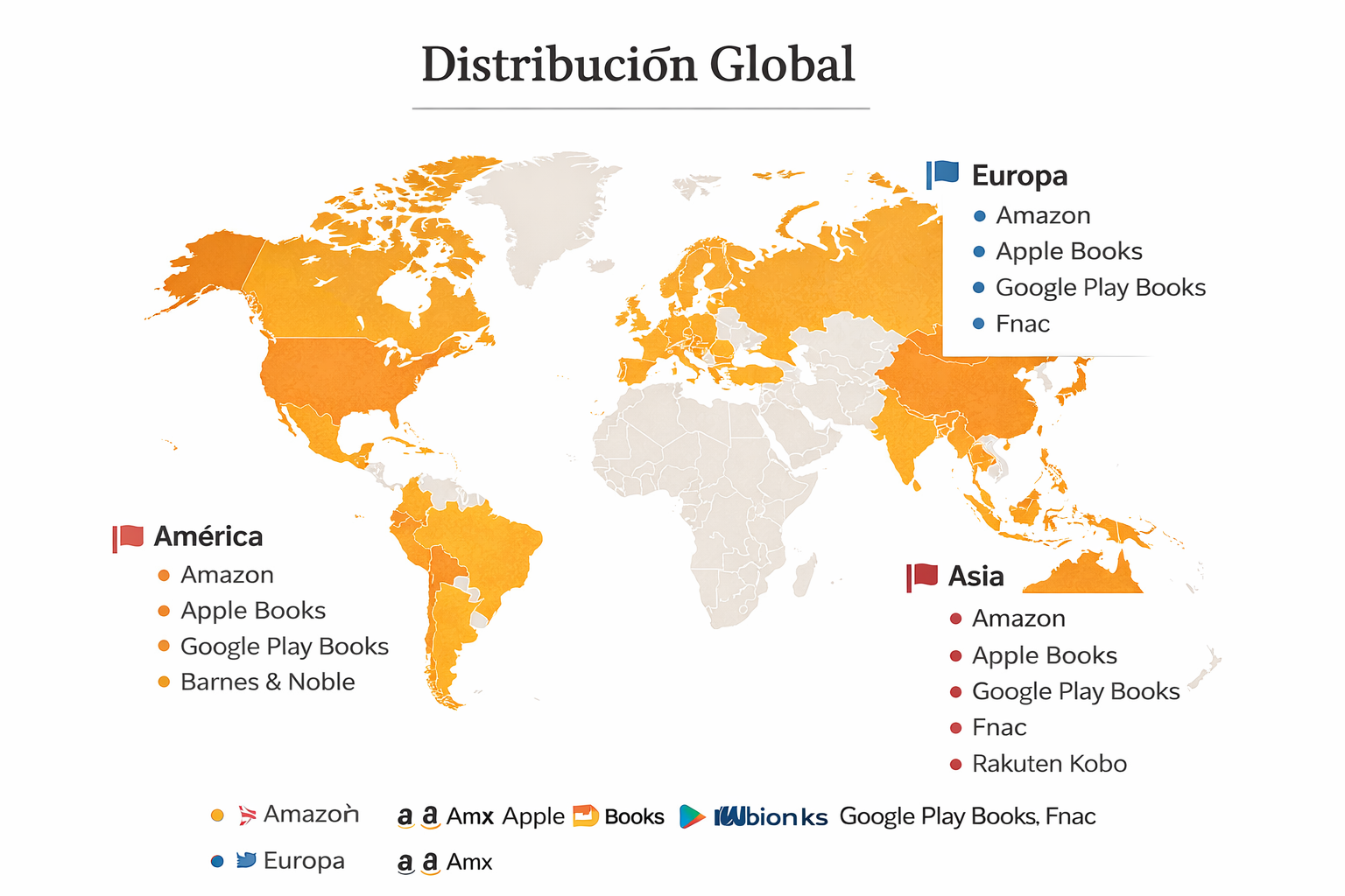 Distribución internacional de En Vuelo Como las Aves en plataformas digitales y comerciales que operan en América, Europa y Asia, a través de redes como Amazon, Apple Books, Google Play Books, Barnes & Noble, Fnac y Rakuten Kobo