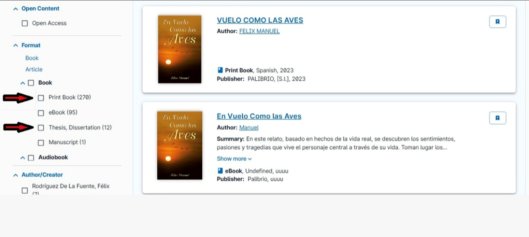 Registro bibliográfico de En Vuelo Como las Aves en WorldCat (2024), mostrando 270 bibliotecas con ejemplar impreso, 95 registros en formato eBook y 12 vinculaciones académicas (tesis/disertaciones)